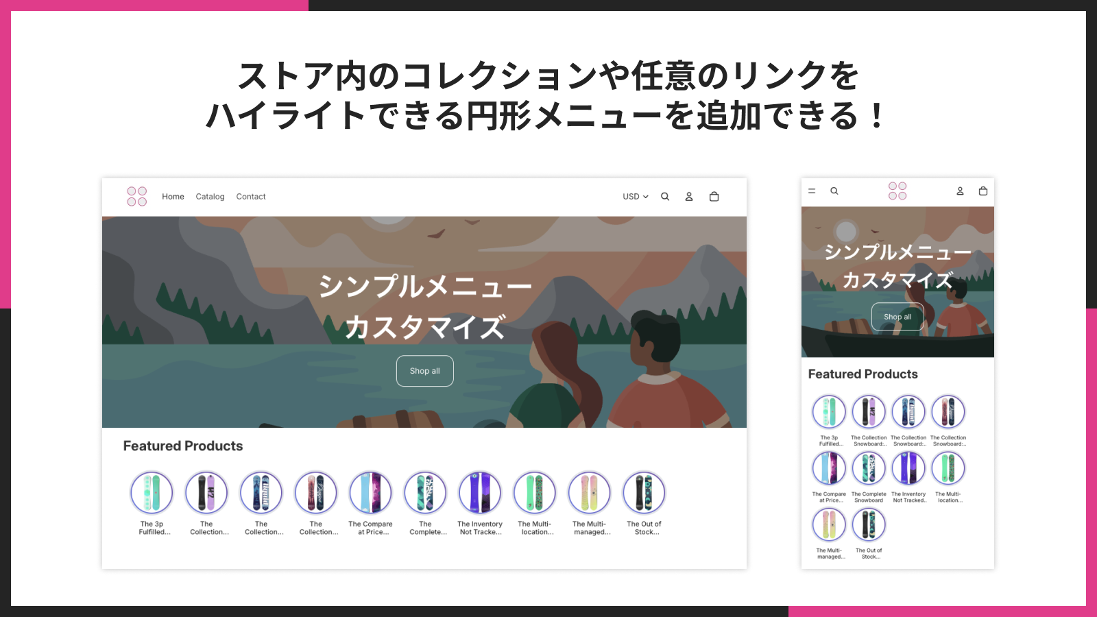 ストア内のコレクションや任意のページへのリンクを、円形アイコンメニューとして表示できます。通常のテキストリンクよりも目立ちやすく、クリック率の向上が期待できます。