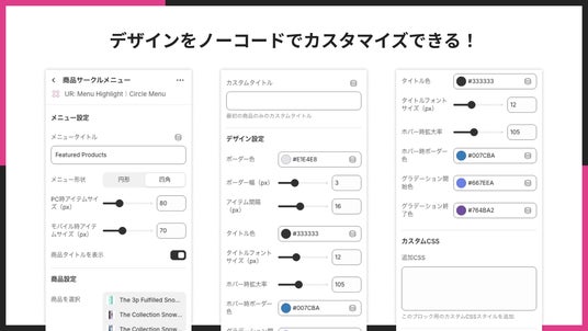 商品ページ・コレクションページ・カスタムページなど用途に応じたメニューを作成でき、コードを書くことなく直感的に設定可能。ユーザーの導線を整理し、回遊率やクリック率の向上をサポートします。
