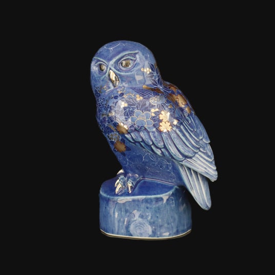 色絵吹墨墨はじき四季花文梟置物(幅14×奥行10×高さ18.5cm)