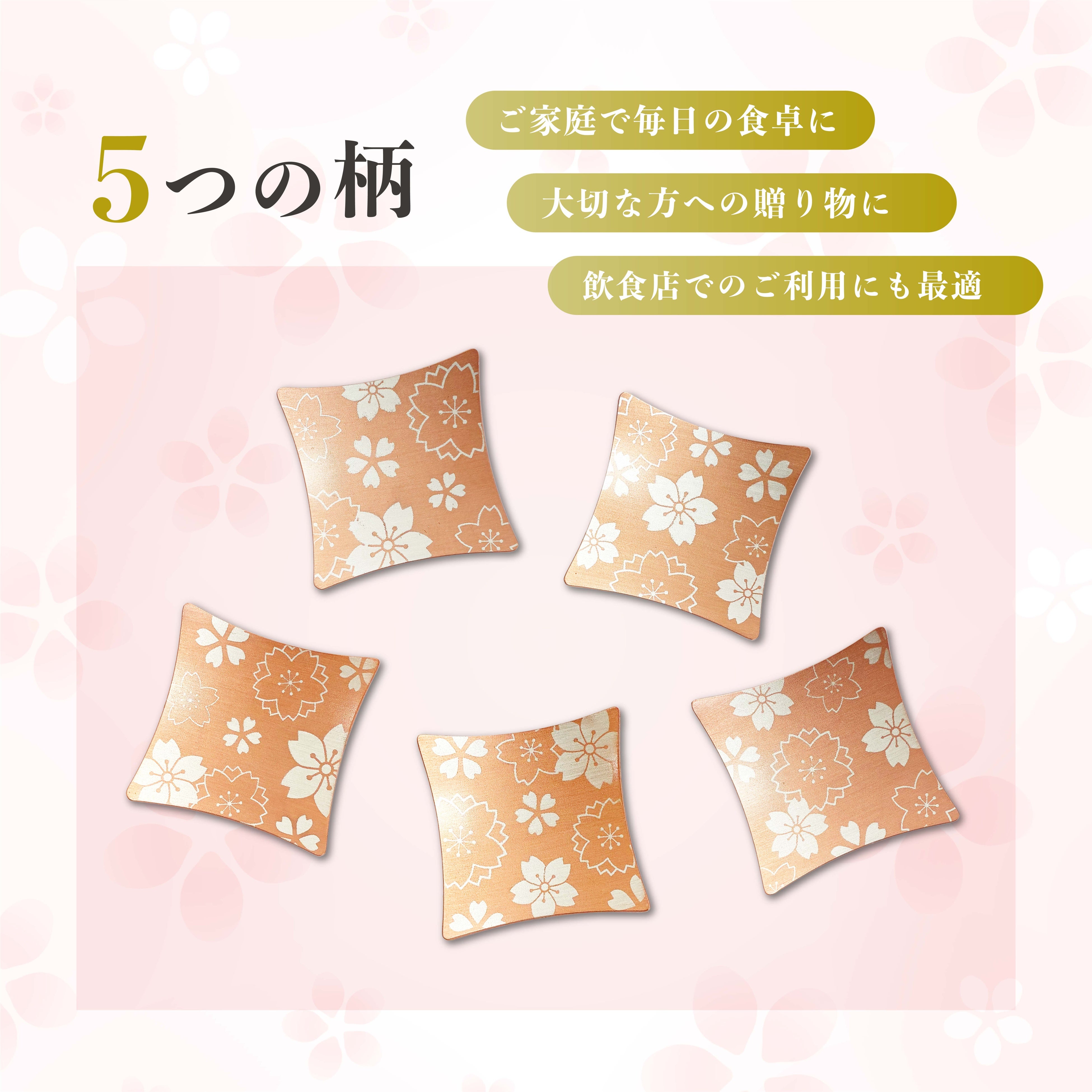 5客すべてに異なる桜柄を配し、統一感の中に変化を持たせることで食卓にやさしく上品な彩りを添えます。