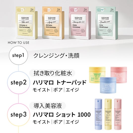 クレンジング・洗顔後の清潔な肌に、ハリマロのスキンケアステップを取り入れてください。