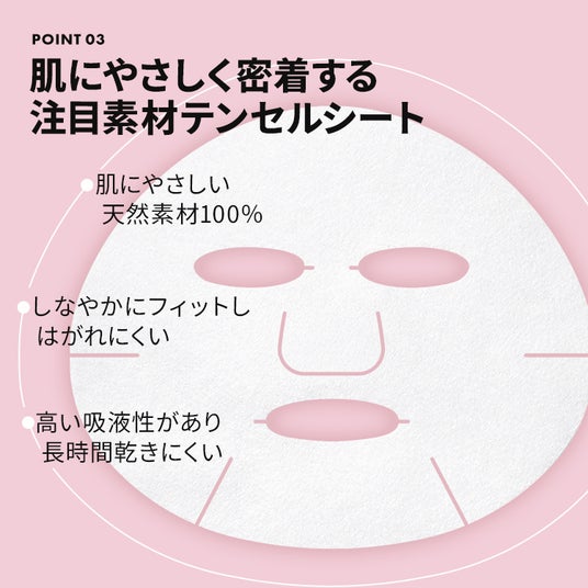 天然素材100%で、しなやかにフィットし、はがれにくいテンセルシートを採用。高い吸液性があり長時間乾きにくいため、集中ケアにぴったり。