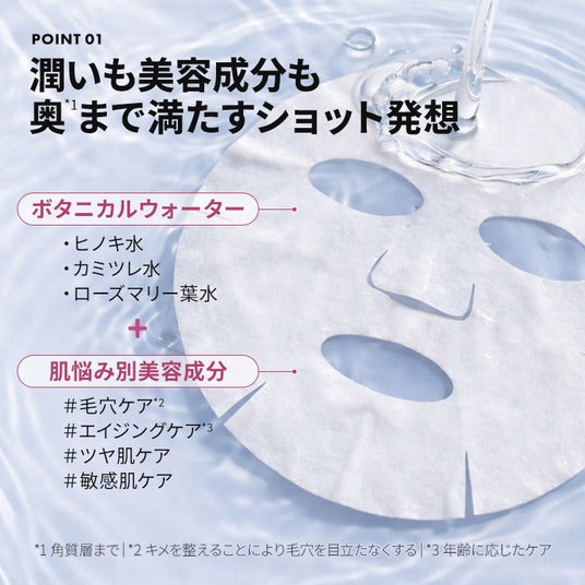 1枚で、潤いも美容成分も肌の奥*までしっかり届けるショット発想。たっぷりの美容液でみずみずしく潤う肌へ導きます。