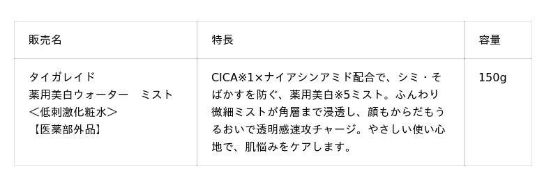 「タイガレイド」ブランドでは2023年2月に「薬用CICAウォーター ミスト」※2、2025年3月に「ウォーターミスト V」を発売し※3、顔はもちろん全身も一気にうるおうことと日本製という安心感に多くのお客さまからご好評いただいています。スキンケア市場においてミスト・スプレー剤型は、肌悩みをケアする機能の追加やニーズに合わせたアイテムの細分化により選択肢が広がり、2025年販売規模は金額前年比124.8%※4と大きく伸長しました。その市場に「タイガレイド」ブランドからも新商品として、ゆらいだ素肌のメラニンの生成を抑え、シミ・そばかすを防ぐ「薬用美白ウォーター ミスト」を発売し、お客さまにより満足いただけるブランドを目指します。