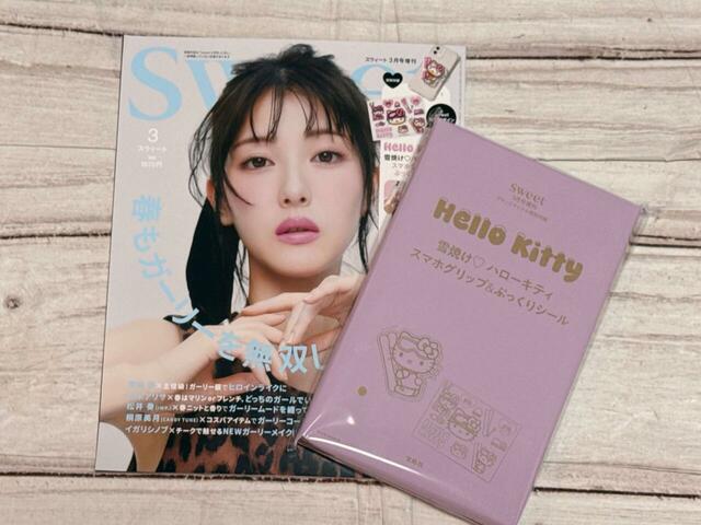 sweet3月号増刊の付録は、描き下ろしの雪焼けキティデザインのスマホグリップとぷっくりシールのセットという満足度の高い豪華アイテム。