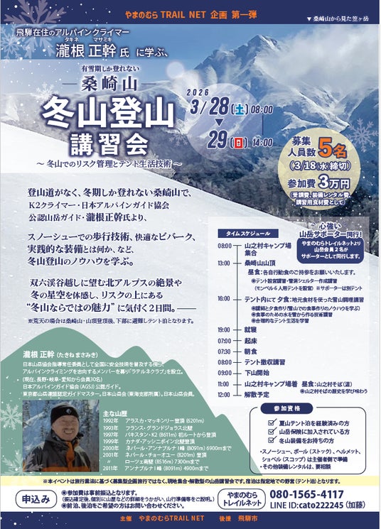 岐阜県飛騨市では、3月28日(土)・29日(日)の2日間、豪雪地帯である同市神岡町の桑崎山(くわさきやま)にて、世界第2位の高峰K2登頂経験を持つ山岳ガイド・瀧根正幹氏を講師に迎えた「冬山登山講習会 ~冬山でのリスク管理とテント生活技術~」が開催されます。