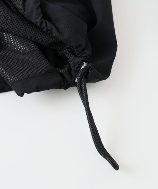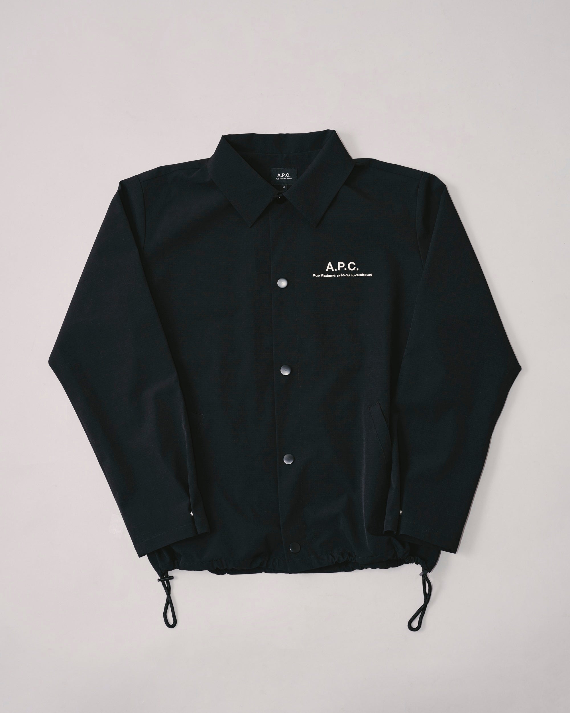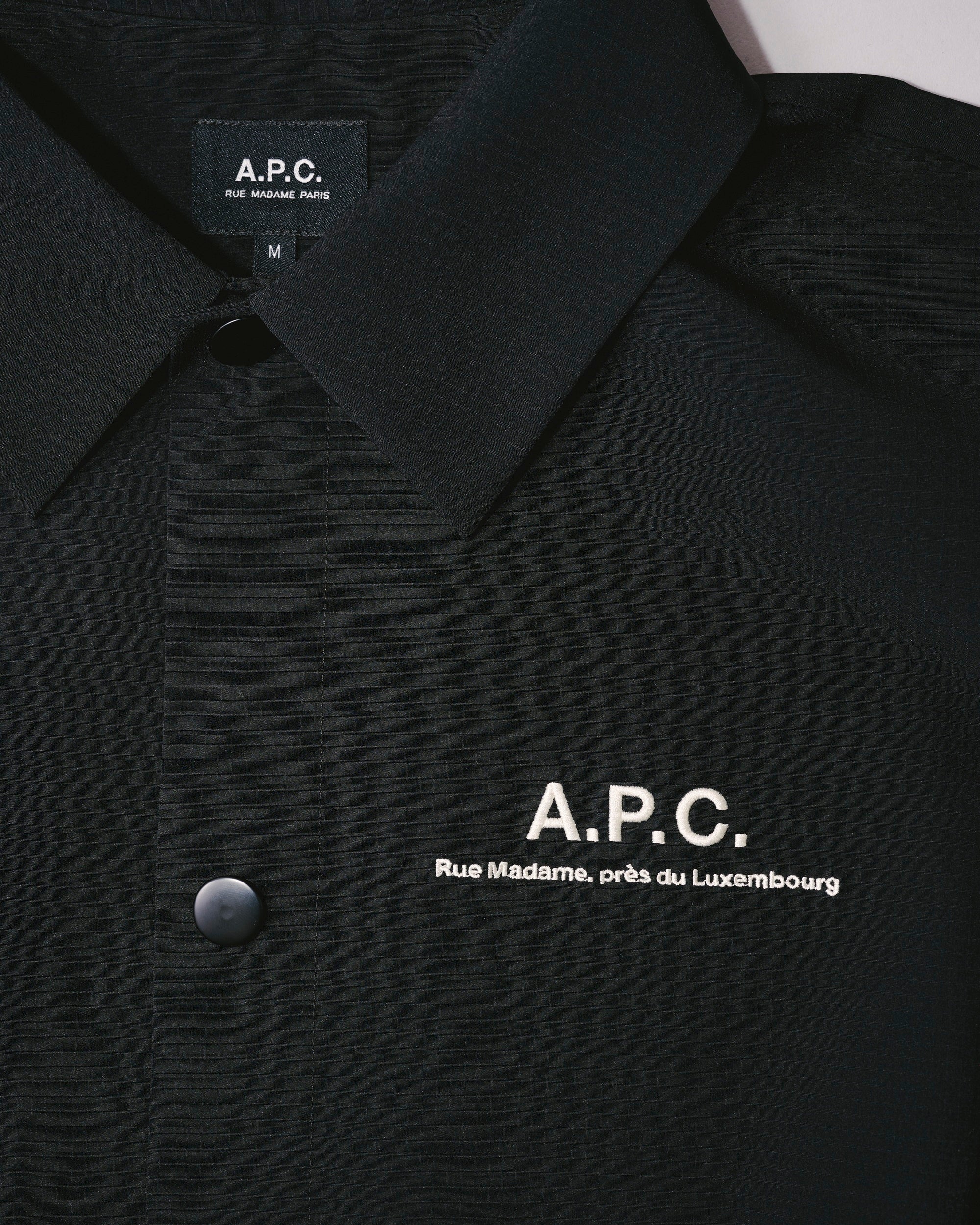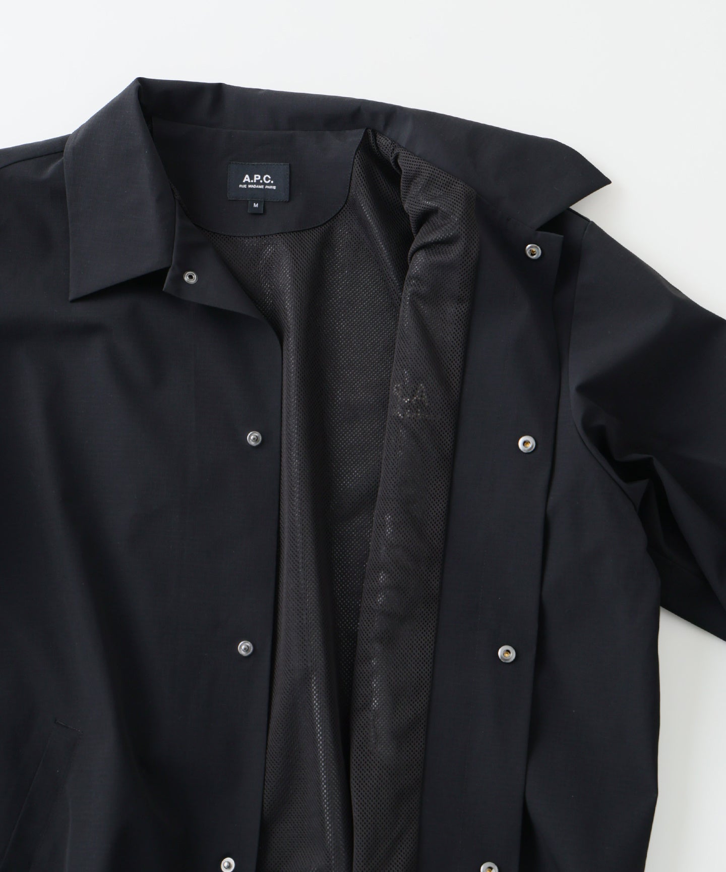 インラインモデルより着丈を短く設定したトレンド感のあるショート丈に仕上げ、身幅にはゆとりを持たせました。裾のドローコードを絞ることで、丸みのあるバルーンシルエットへと変化します。表地には、耐久性と軽量性に優れたリップストップ生地を採用。上品な佇まいはそのままに、アメカジをルーツに持つレリュームのフィルターを通して、テックウェアの機能性をプラスしています。裏地には通気性に優れたメッシュ素材を使用し、汗ばむ季節でも肌離れが良く、Tシャツの上からさらっと羽織れる一着。春先から初夏までロングシーズン活躍します。スナップボタンやドローコードなどの付属パーツはブラックで統一し、全体をミニマルでシックな印象に。さらに、2026年より新たに採用されるA.P.C.の新ロゴデザインを搭載。洗練されたタイポグラフィが、控えめながらも確かな存在感を放ちます。