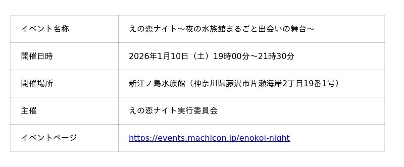 本イベントは、夜の新江ノ島水族館を特別に貸し切り、「まだ知らない誰かと出会う」をテーマに光ゆらめく夜の水族館の中、参加者同士が自然と交流できる仕掛けやキッカケを通じて特別な出会いをお届けするために開催されました。