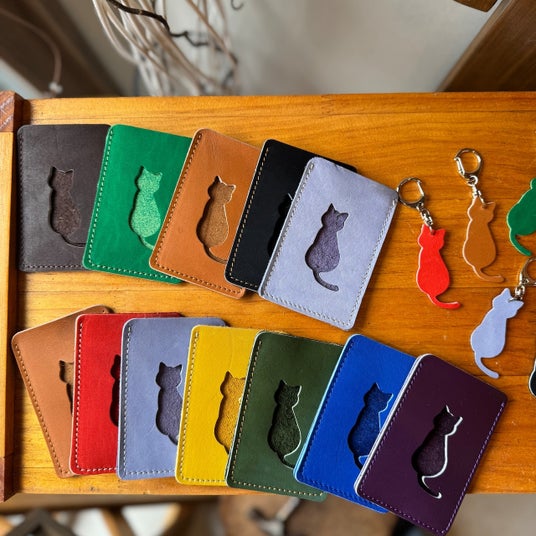 ほかにも、丁寧に仕立てた猫シルエットパスケースや、遊び心あふれるハンドサインキーホルダーなど、日常使いしやすいアイテムを多数ご用意しています。
