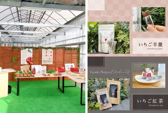 左:観光農園内併設の直売所 右:販売している「いちご羊羹」と「いちご紅茶」