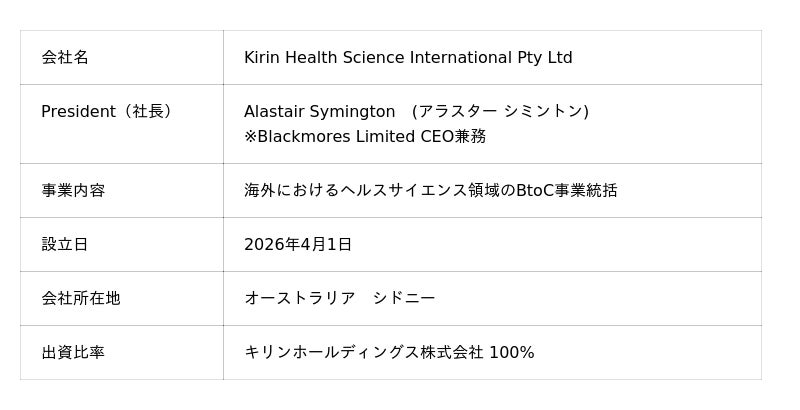 キリンホールディングス株式会社(社長 COO 南方健志、以下キリン)は、日本を除くヘルスサイエンス領域のBtoC事業を統括する新会社「Kirin Health Science International Pty Ltd(以下KHSI)」を2026年4月1日に設立します。