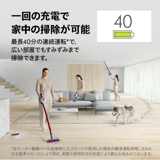 ツールを付け替えることで、スティック・布団クリーナー・ハンディの1台3役に対応。床はもちろん、ソファやベッド、車内までこれ1本で完結します。最長40分の連続運転(モーター駆動ヘッド使用時は約30分、強モードは約5分)を実現し、日々の掃除には十分なスタミナを備えています。