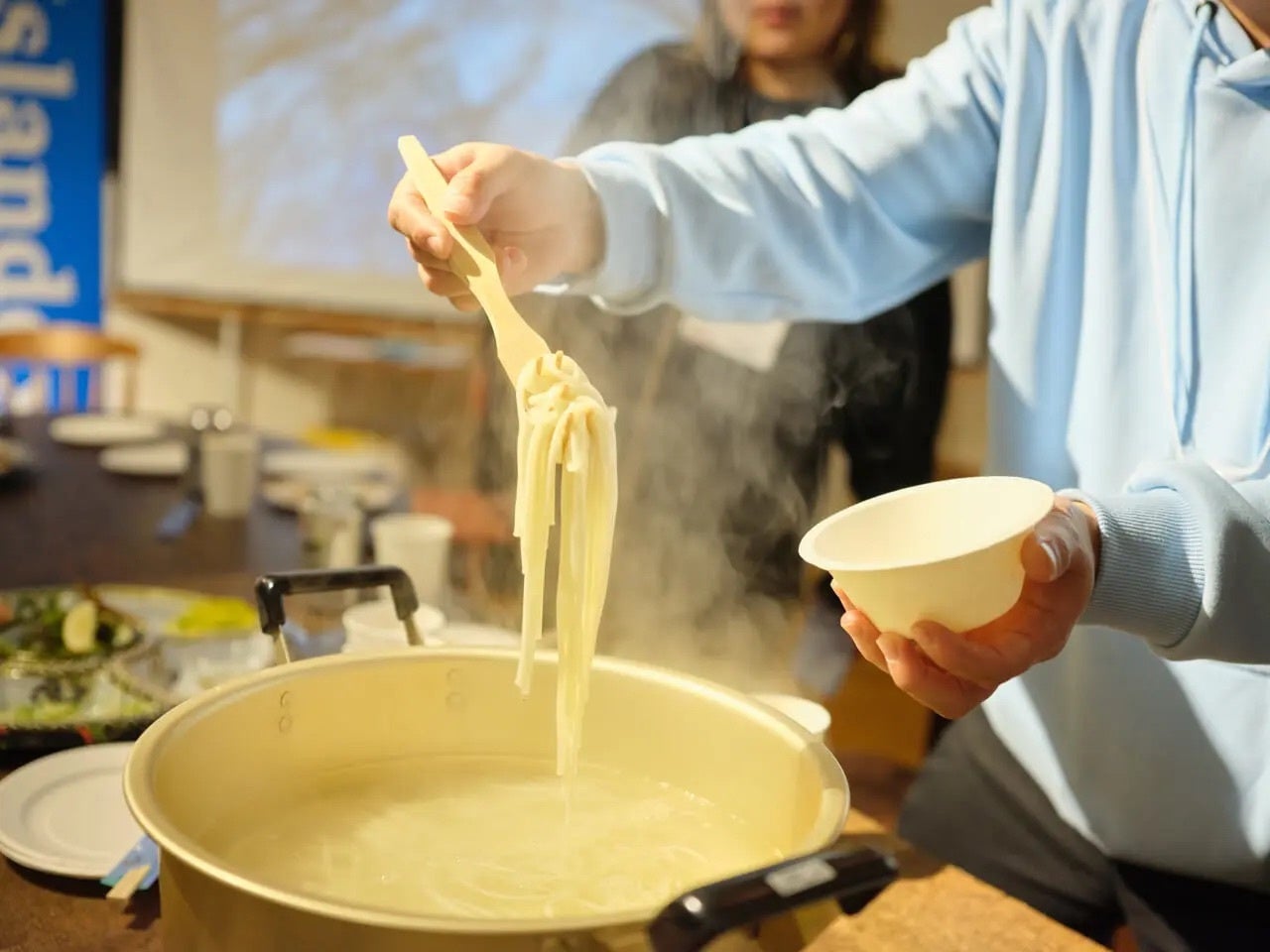トーク後には、島の海産物を使った寿司の実演や、五島手延うどんの「地獄だき」を囲む交流会を実施。