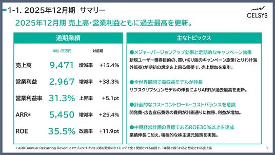 ・2025年12月期の業績2025年12月期は、売上高94.7億円(対前期比+15.4%)、営業利益29.6億円(対前期比+38.3%)、ARR54.5億円(対前期比+25.4%)となり、売上高・営業利益ともに過去最高を更新しました。KPIの中核としているサブスクリプションARRについては、毎年継続して実施するバージョンアップや機能追加アップデートにより、ユーザー数の増加・契約ライセンスの継続を実現しています。