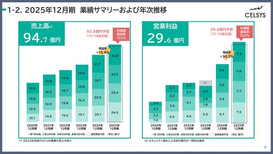 セルシスは、2月13日(金)に「2025年12月期 決算短信」を発表し、2025年 通期の経営成績が、売上高・営業利益等の主要な収益指標において過去最高を更新したことをお知らせします。