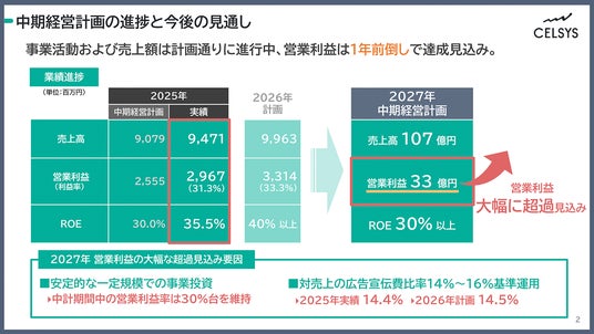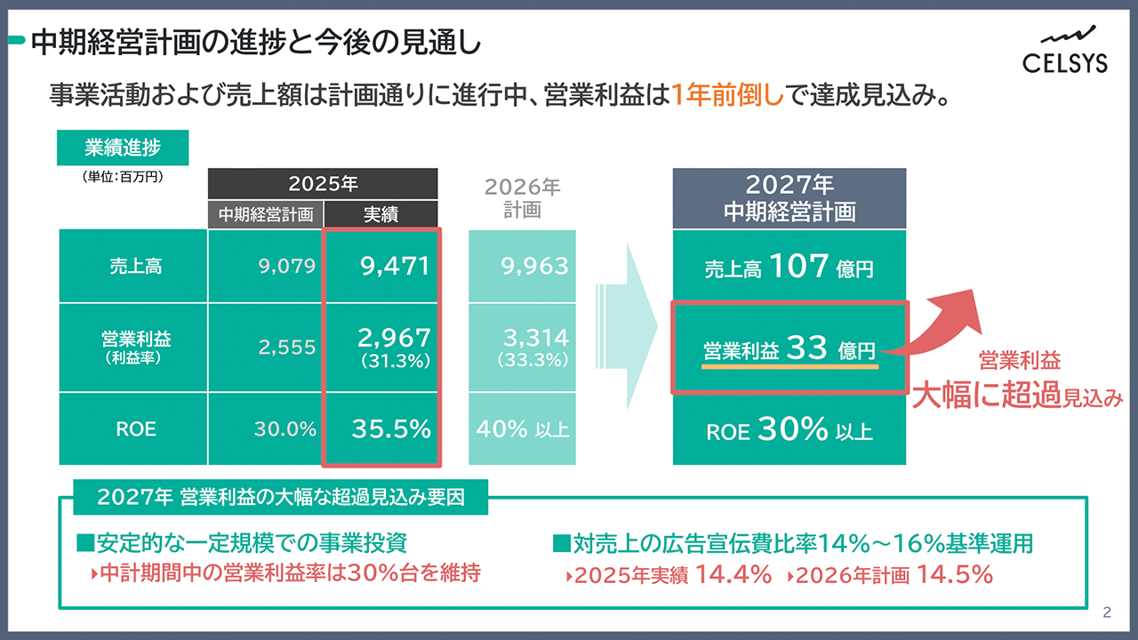 「中期経営計画 2025-2027」の初年度にあたる2025年12月期の業績は、グローバル展開する主力の「CLIP STUDIO PAINT」を中心に、堅調な事業推進の結果、収益は期初想定(期初計画)を上回る着地となりました。また、中期経営計画の目標であるROE30%についても達成しています。営業利益は、中期経営計画の数値を1年前倒しで達成見込みです。