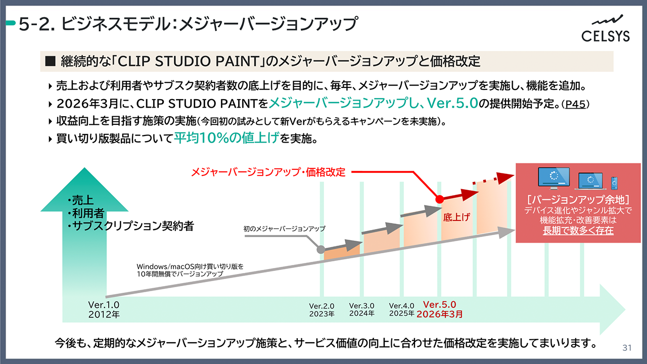 グローバル展開する「CLIP STUDIO PAINT」は、定期的なメジャーバーションアップを実施し、サービス価値の向上に努めるとともに、利用者数・サブスクリプション契約者数の底上げを目指しております。2025年3月に実施したメジャーバージョンアップ(Ver.4.0)は、全世界で多くの反響をいただき、当初計画を上回る販売実績となりました。なお、2026年3月にはVer.5.0の提供を予定しており、買い切り版製品について平均10%の値上げを実施予定です。