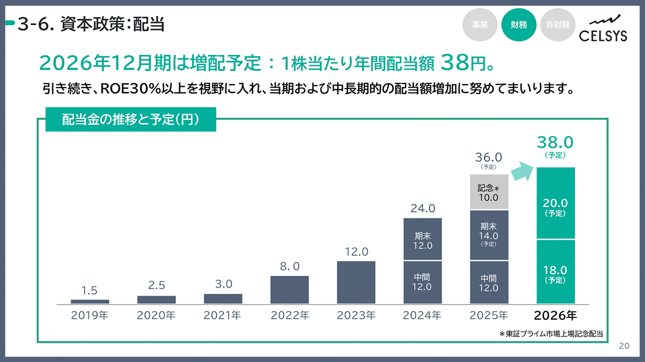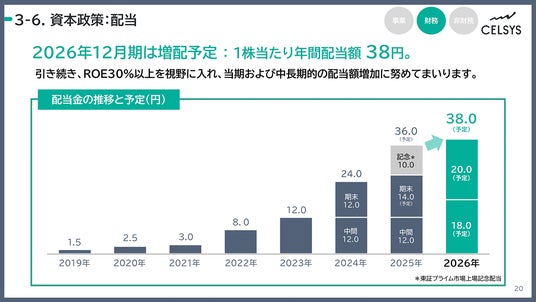 当社は、株主還元を重視しており、2022年12月期より自己株式の取得を継続して行い、2025年12月期の20億円を合わせて累計で65億円分を実施しております。また、2025年12月期の1株当たりの年間配当額は、プライム上場記念配当10円を含む合計36円(前年より12円の増配)を予定しており、2026年12月期においてもそれを上回る38円とし、引き続き増配を予定しています。