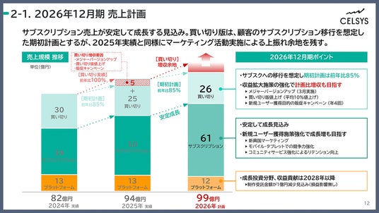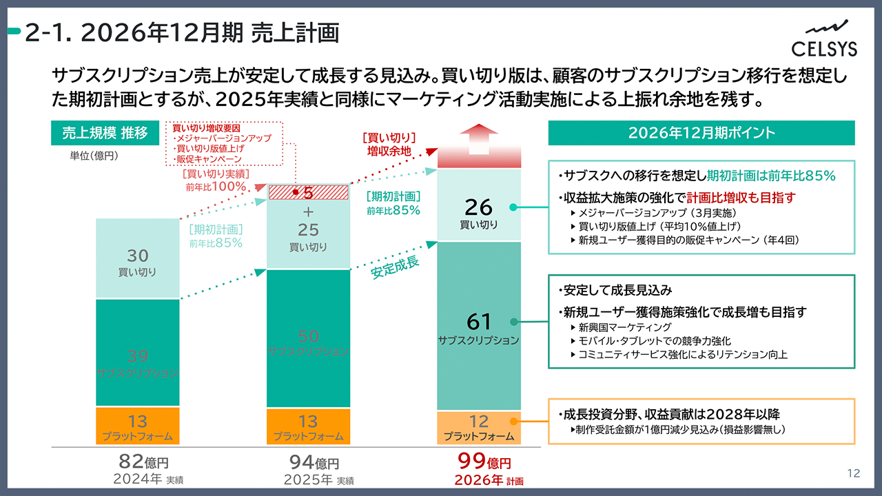 2026年12月期は、売上高99億円を計画しております。クエリエイターが作品をつくることをサポートする「クリエイターサポート分野」においては、主力の「CLIP STUDIO PAINT」にて、サブスクリプション売上が安定して成長する見込みで、引き続きグローバル展開の強化による新規ユーザーの獲得、若年層・ライトユーザーの取り込みによるユーザー拡大、ユーザーコミュニティの強化による継続利用率の向上を目指してまいります。