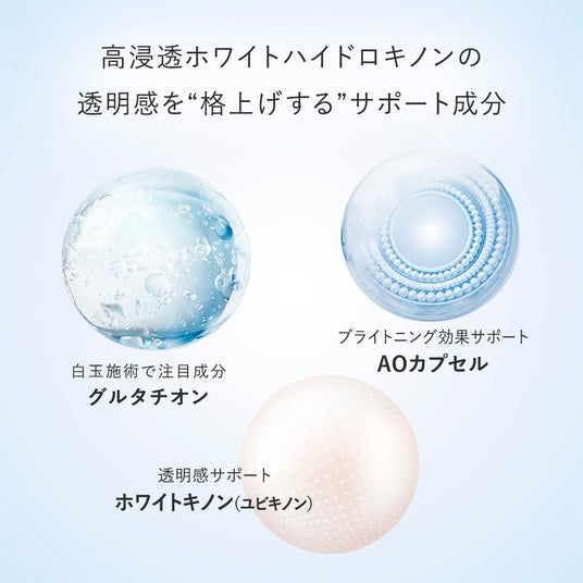 「高浸透*⁴ホワイトハイドロキノン*⁵」のブライトニング効果を引き出し、冴えわたる白玉スキン*²へ白玉施術で人気の「グルタチオン*⁵」をはじめ「ホワイトキノン(ユビキノン)*⁵」や「速攻型ビタミンC誘導体*⁶」を搭載した新『AOカプセル*⁷』を配合。「高浸透*⁴ホワイトハイドロキノン*⁵」のブライトニング*³効果を進化させ、透明感*¹パフォーマンスを格上げします。