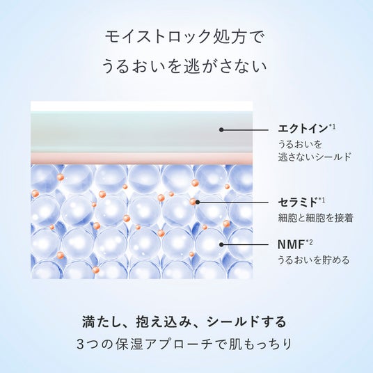 モイストロック処方でうるおいを逃がさない。内側からみずみずしさ満ちてキメふっくら「セラミド*⁸」が角質層間を満たし「NMF*⁹」が角質ひとつひとつに蒸発しにくい結合水を抱え込みます。砂漠の生命体に多く存在する“スーパーモイスチャライザー”「エクトイン*¹⁰」がうるおいを逃さずキープ。三位一体の保湿アプローチによりうるおいが止まらない、内側からみずみずしさあふれる美肌へ。