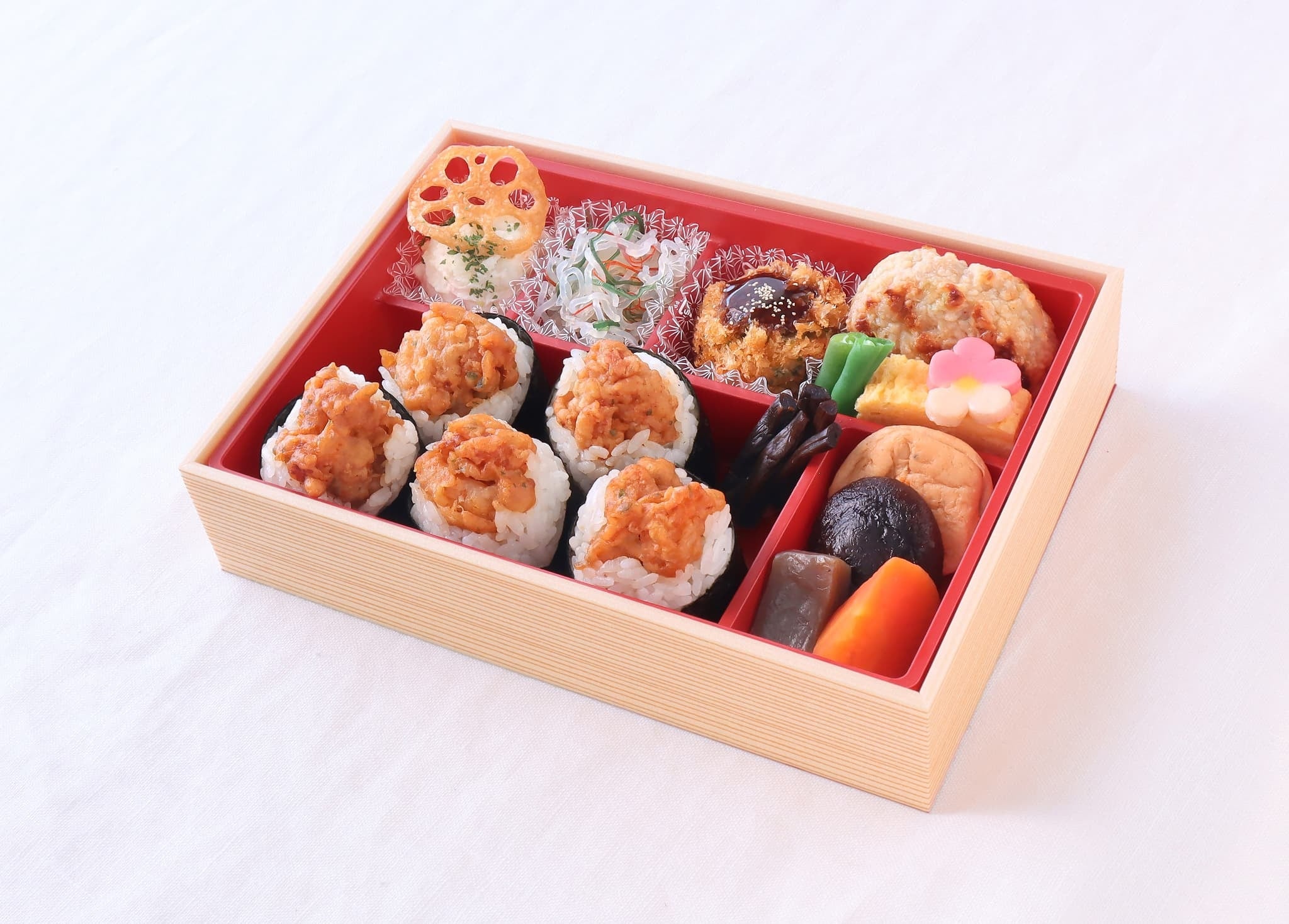人気の天むす5個に鶏のつくね、ホタテの磯辺フライなどが入った満足弁当です。