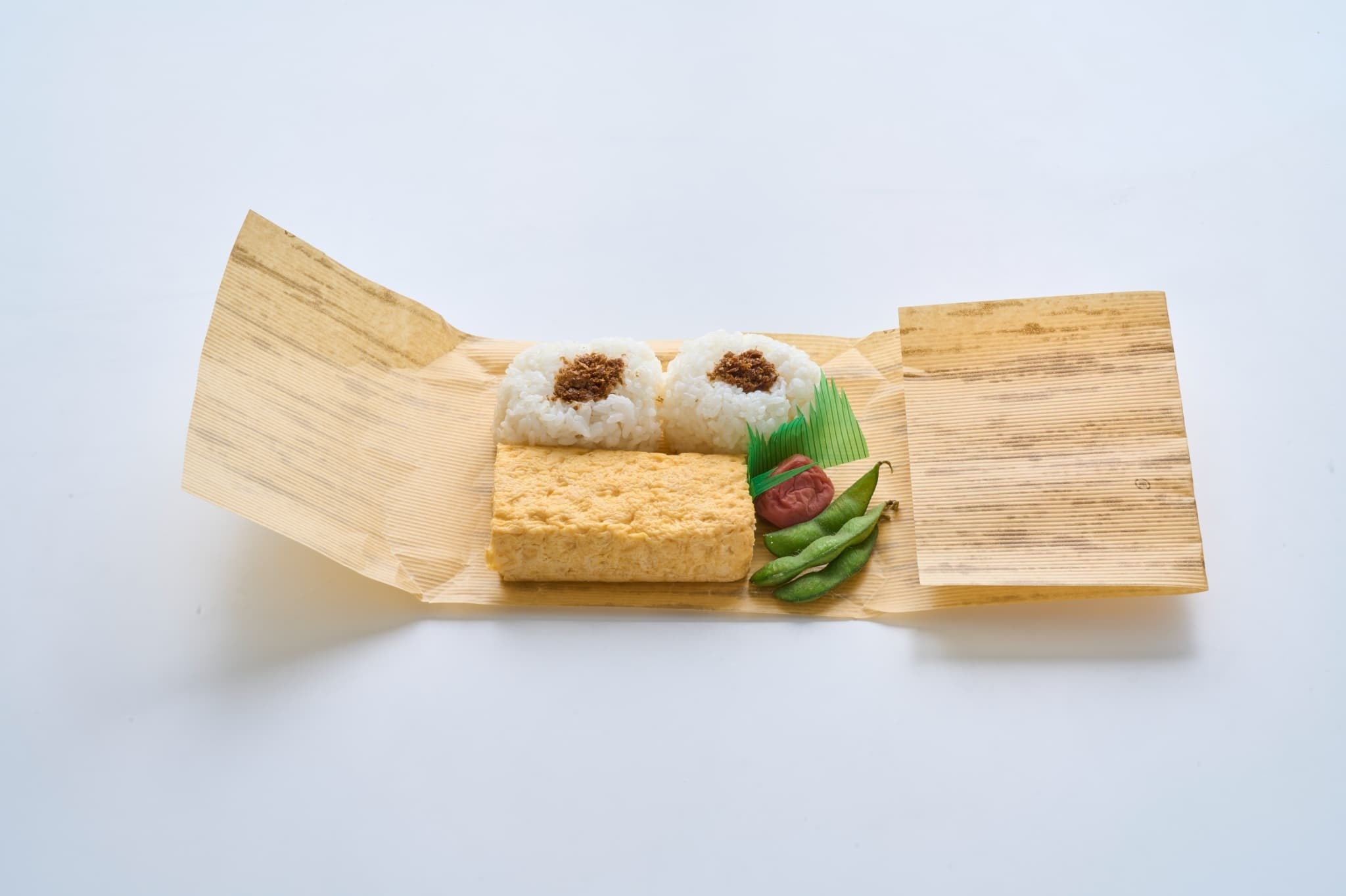 出汁を効かせた薄味の関西風の出汁巻きです。おにぎりにおかかをのせました。
