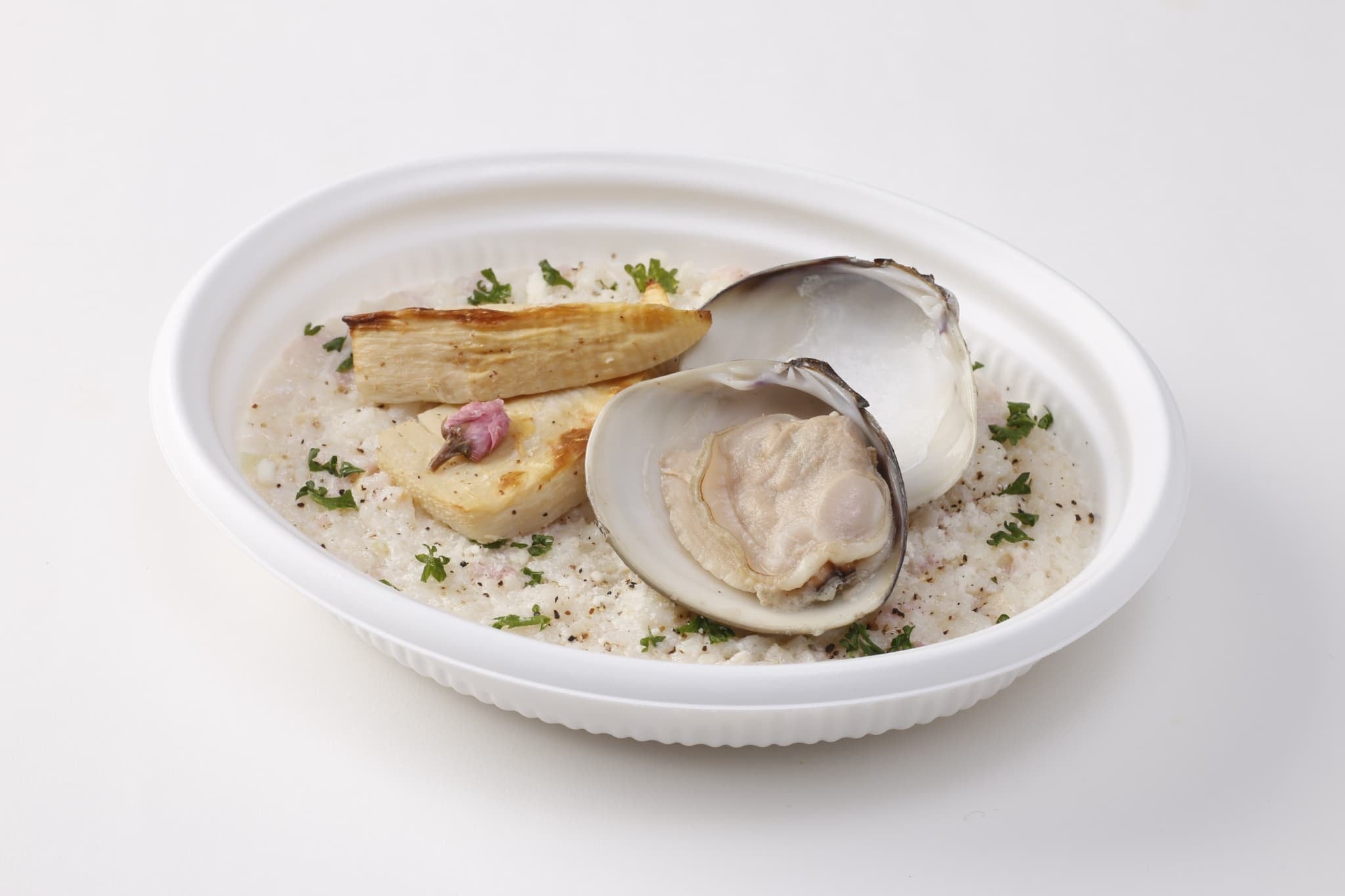 「桜の花」や「はまぐり」を飾った季節限定商品。リゾットにはベーコンやタケノコをアクセントに加えました。