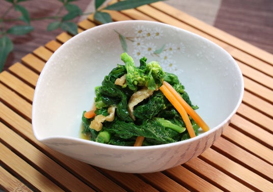 〈おかず本舗佃浅〉菜の花辛子和え100gあたり 572円菜の花のほんのりとした甘味と苦味が辛子の味付けと良く合います。白ごまと油揚げがコクに深みを出しています。