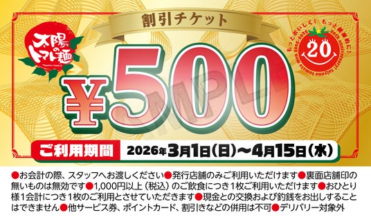 トマトラーメンの専門店「太陽のトマト麺」(運営:株式会社一品香)は、創業 20 周年を記念し、2026 年2月 16 日(月)から 28 日(土)の期間限定で、1,000 円(税込)の利用毎に 500 円のチケットを1枚プレゼントするキャンペーンを太陽のトマト麺直営店全店にて開催いたします。