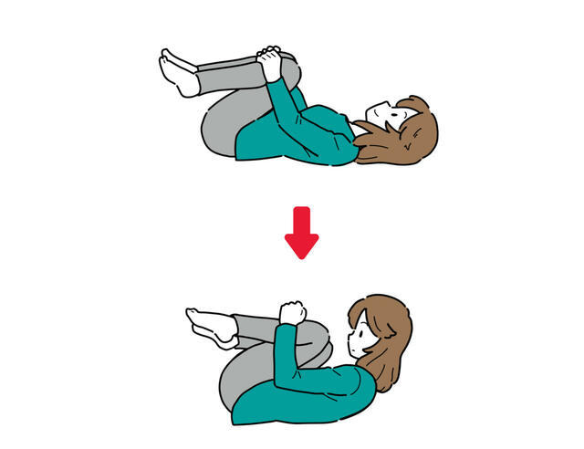 余裕があれば頭を持ち上げて背中を丸めましょう。両ひざを抱えるのが難しい場合は、片ひざずつ抱えてもOKです。