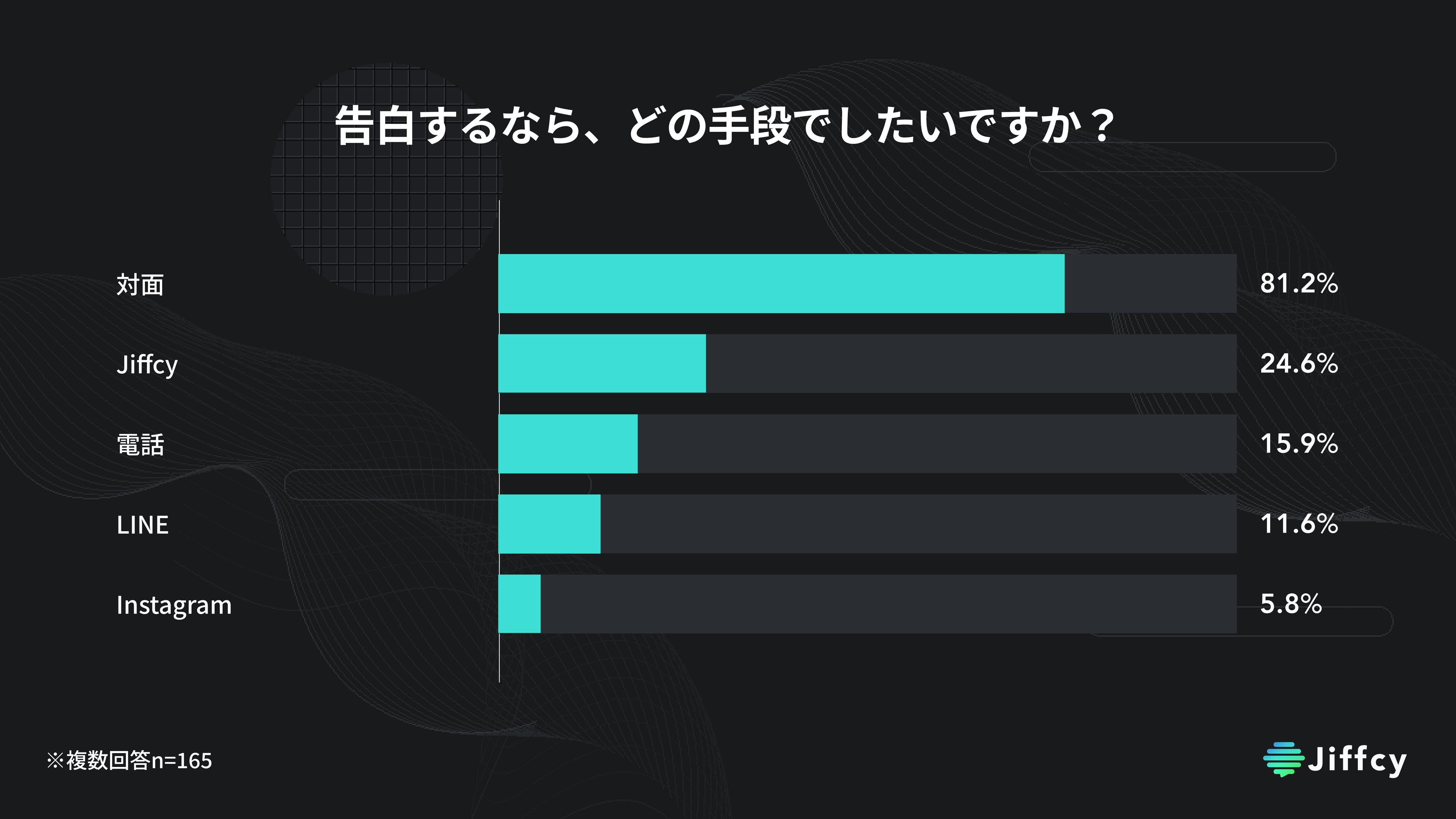 「告白するなら、どの手段でしたいですか?」という質問に対して、一番多かった回答は「対面」(81.2%)、次に「Jiffcy」(24.6%)、「電話」(15.9%)という結果となりました。