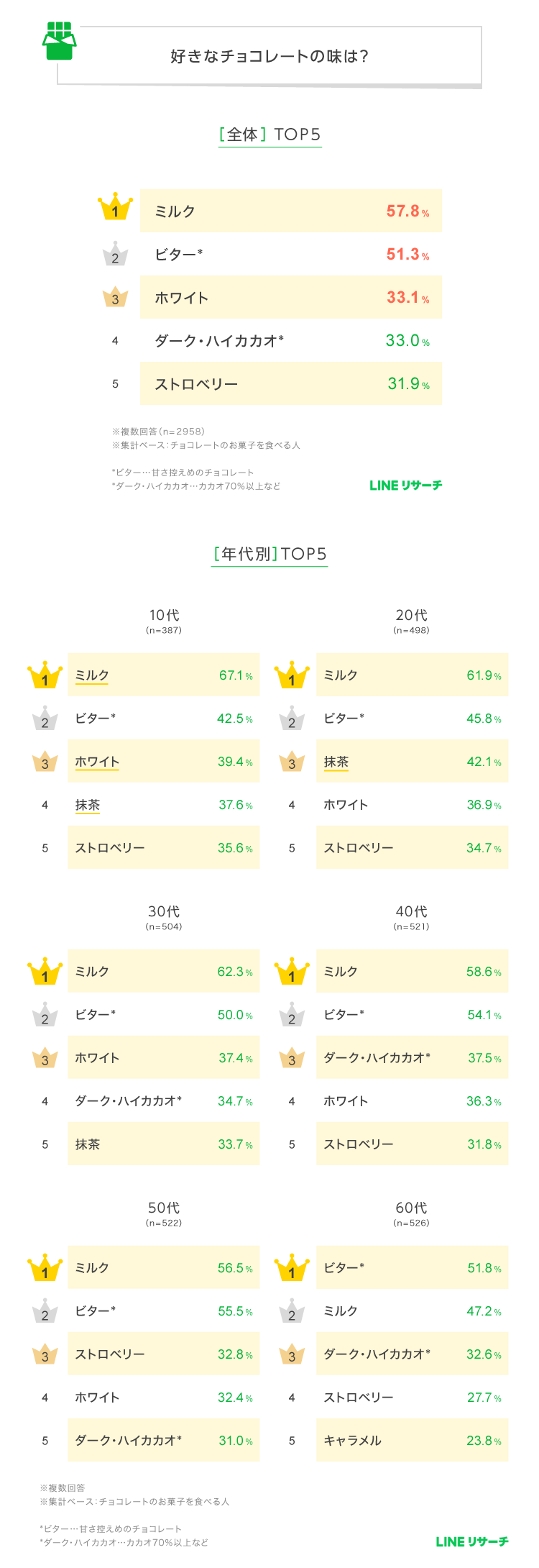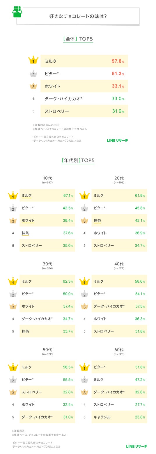 全体TOP2は「ミルク」「ビター」。10代~50代は「ミルク」60代は「ビター」が1位。10代~20代は「抹茶」も人気。