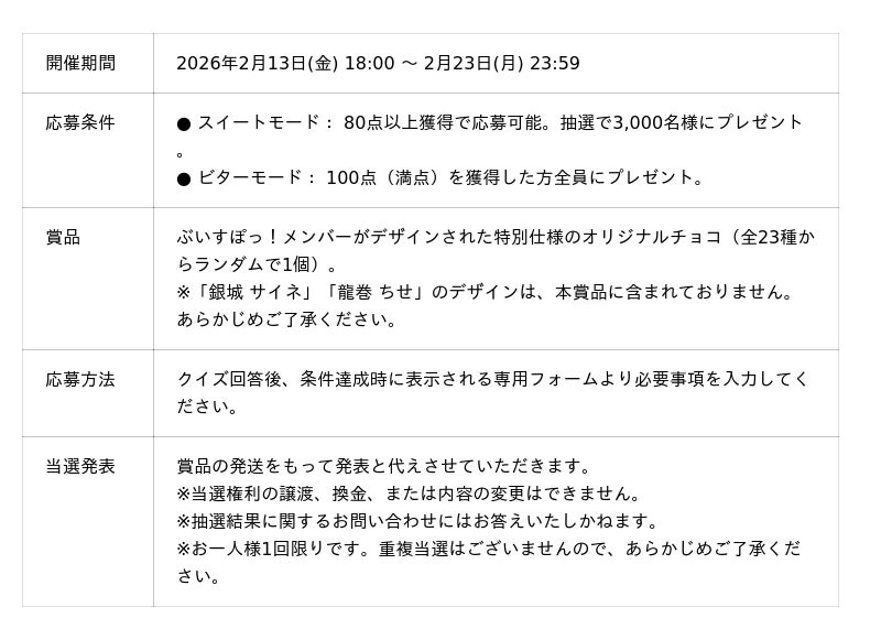「ぶいすぽっ!チョコっとクイズ」は、メンバーに関する知識(愛)を問うバレンタイン特別企画です。難易度は「スイートモード」「ビターモード」の2種類をご用意いたしました。クイズ回答後、条件を達成された方は専用フォームよりお申し込みいただけます。ご応募いただいた方へ、オリジナルチョコ(全23種)をランダムで1個プレゼントいたします。