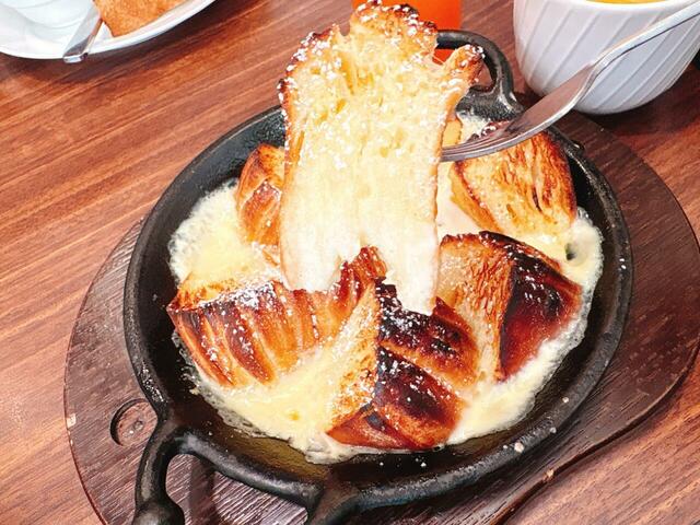 熱々の鉄板で提供されるフレンチトーストは、外側はデニッシュ特有のサクサク感があり、中はアパレイユが染みてトロトロ。たっぷりのメープルシロップをかければ、甘い香りが広がり、至福のひとときが訪れます。