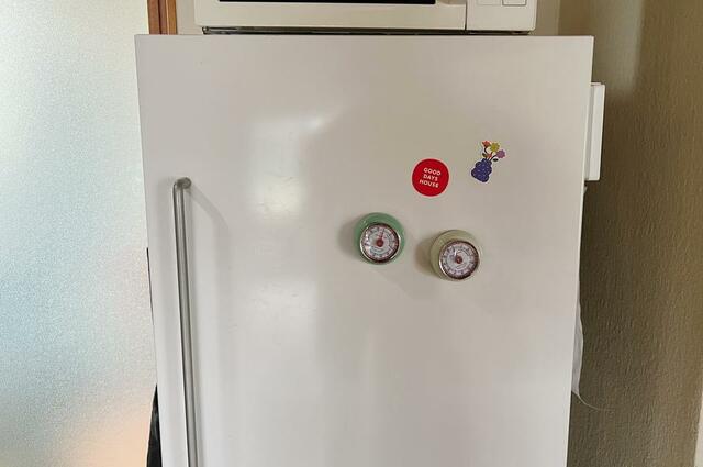 さっそく冷蔵庫横に貼り付けてみました。マグネット面がピタッと密着し、安定感は◎!