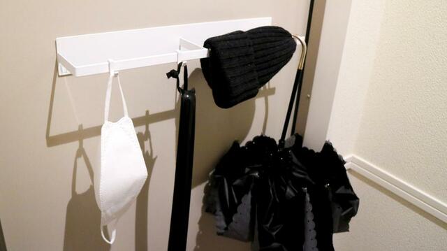 お風呂の掃除グッズを吊り下げたり、玄関の収納に使ってみたり……マグネットも強力なので、傘をかけても落ちませんでした。