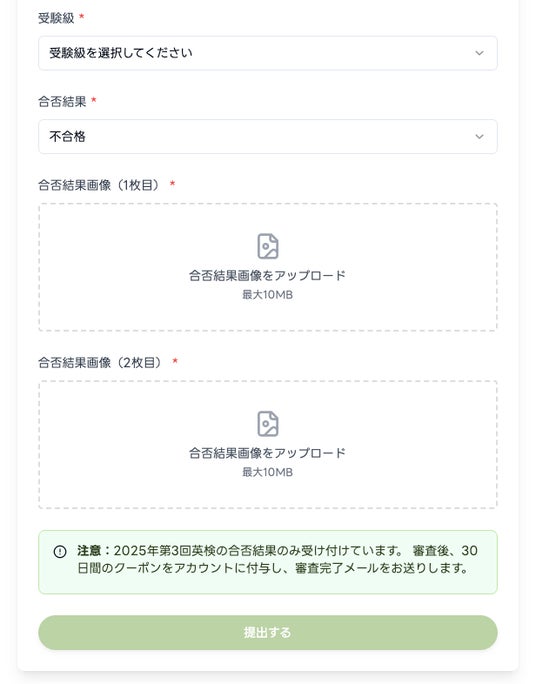 - 提出はログインが必要です(クーポン付与はアカウント単位で行います)- 提出する画像は「英検(R)公式サイトの正式な結果」をご利用ください