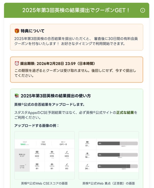 公式スコアの画像提出で、CSEスコア予測(合否判定)の精度向上に貢献できる!2/28までの提出で英検(R)学習アプリ「スタスタApps」有料会員Plus(1,000円)相当クーポンをご提供