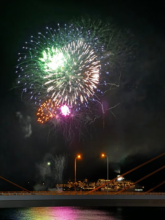 街中を練り歩く通常運行とは異なり、水面に映るねぶたと花火が一体となる、静かで美しい光景が特徴です。