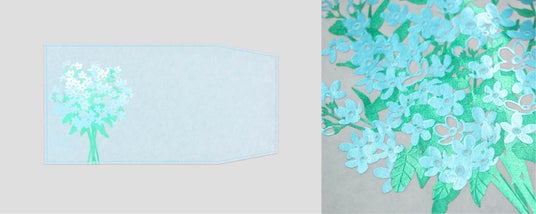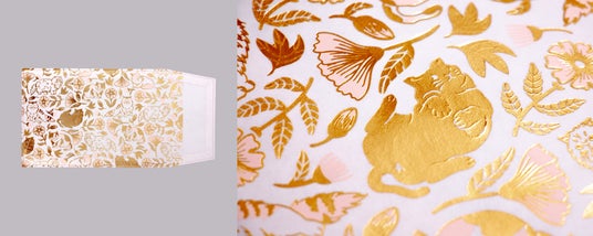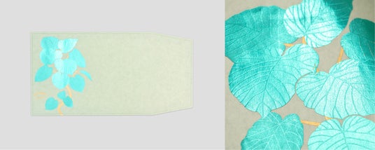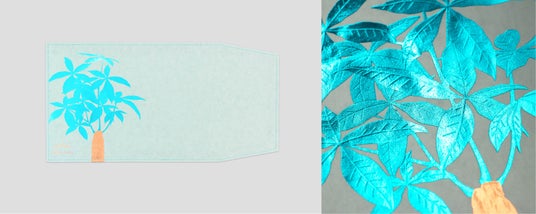 箔押し加工とは熱と圧力によって、紙に箔を圧着させる技法です。浮世絵の木版画を刷り上げていくように、1枚ずつ金属板をつくり、2度3度と箔を重ねて絵柄を完成させていきます。