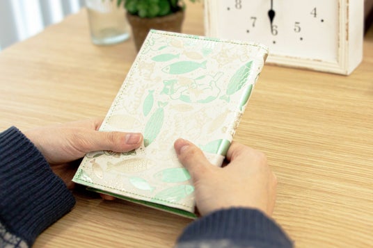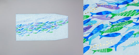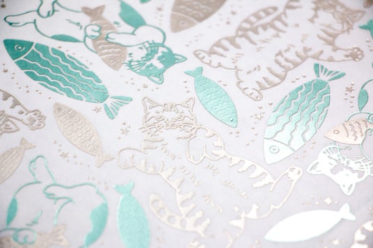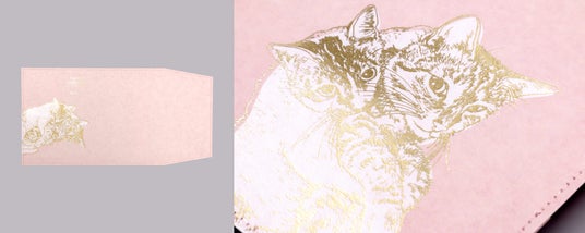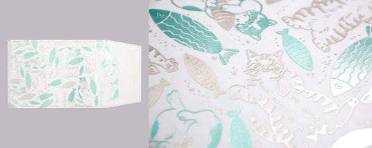 受賞された「fish」のデザインは全面が箔押しで表現されたかわいい猫のイラストが、他にはない魅力を引き出しています。フィンランドで開発された、布のような質感の紙「PAPTIC」を使用することで、箔押し加工と縫製を実現した新感覚のブックカバーです。