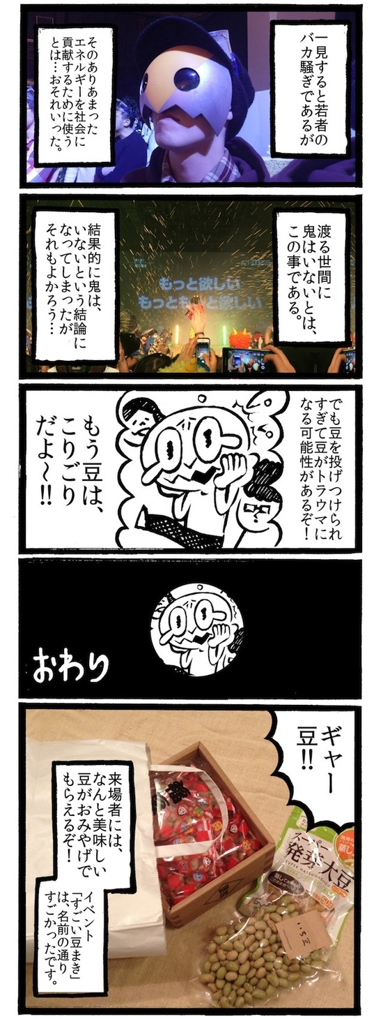 フォトギャラリー「すごい豆まき2015」の様子はコチラ カメントツ カメントツ X 仮面を被った漫画家ライターゆえにカメントツ。オモコロでもマンガを描いているという噂がある。仮面凸ポータルから呼ばれればどんなときも予定があいてれば駆け付けるぞ。 過去の記事 そこそこ仕事をもらえるようになったWeb漫画家のリアル 青春を取り戻せ!! 今さらじゃない、今だからこそ"あゆのライブ"へ行ってみた 【黒歴史】大学デビューではっちゃけすぎると後でめちゃめちゃ後悔するぞ! X Facebook « 1 2 3 関連記事 戦後、祖父がコスプレした理由が壮絶過ぎた 米国で過ごした幼少時代、ぼくをイジメから救ってくれたのはハイパーヨーヨーでした 海外を例に上げるのはやめませんか? もう何でも自分の話に持っていくのはやめませんか? 【関西人限定】もう下手な関西弁に怒るのはやめませんか? もう「女って怖い」は卒業しませんか? 銭湯神ヨッピーが語る!見ると銭湯に行きたくなる最高の入浴法 焦点工房、第二回Nikon系YouTuber「勝手にファンみぃてぃんぐ」に出展 >バーグハンバーグバーグオモトピア漫画イベント東京タワー豆まき