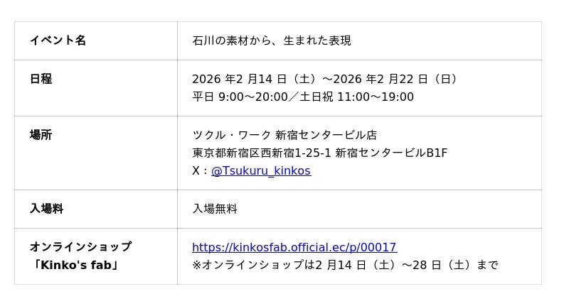 紹介する展示イベント「石川の素材から、生まれた表現」を、2026 年2 月14 日(土)から22 日(日)まで、ツクル・ワーク新宿センタービル店(以下、ツクル)にて開催します。