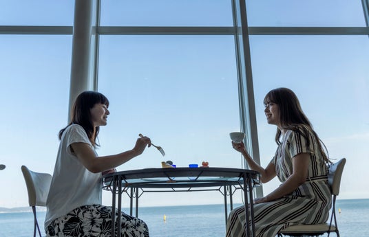 ホテルご到着後は、きらめく海を望む絶景カフェで、人気の鳴門金時パフェ、またはロングランスイーツ鳴門金時タルト&ティーをプレゼント。