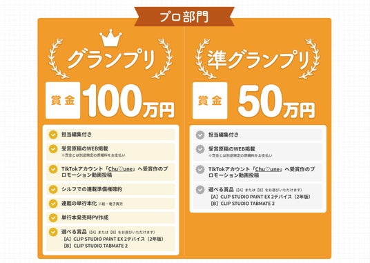 新人部門・プロ部門それぞれ見事グランプリに輝いた作品は、受賞原稿がWEBに掲載。連載準備権が確約され、単行本発売への道が拓かれます。また、公式TikTokやPV作成による手厚いプロモーションのサポートも。