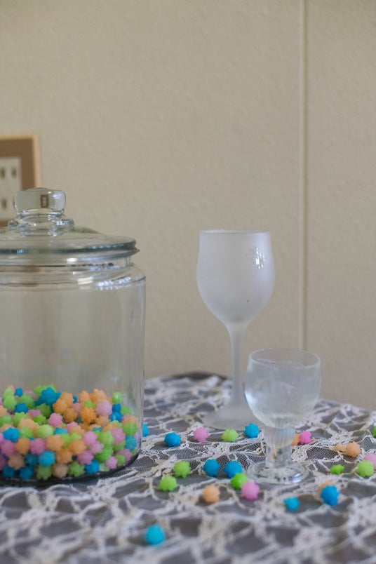 乾杯によって誕生する砂糖菓子「乾杯糖」など、物語に登場するアイテムを模した小物も原画と共に展示