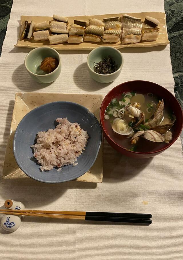 焼き穴子、梅干し、小松こんぶ。もちきびごはんとアサリどっさりの味噌汁。