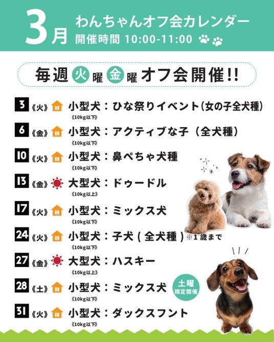 3日(火) :ひな祭りイベント(女の子全犬種/小型10kg以下)6日(金) :アクティブな子(全犬種/小型10kg以下)