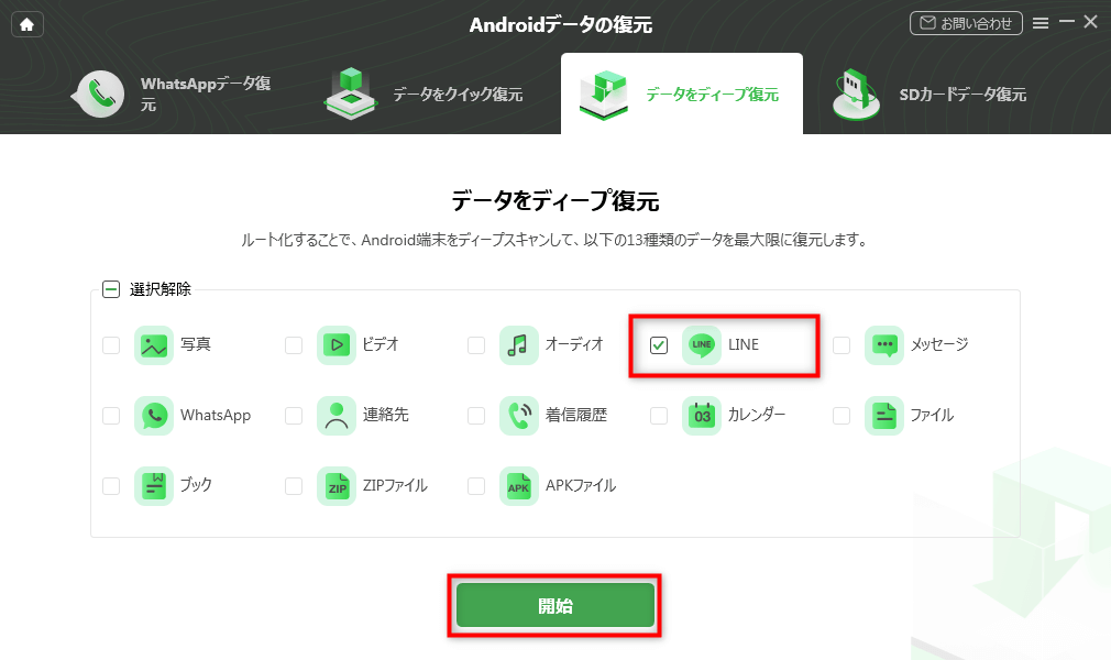 Step3.復元可能なデータ一覧から「LINE」を選びます。「開始」ボタンをクリックし、端末内の LINE データを分析・読み込みます。